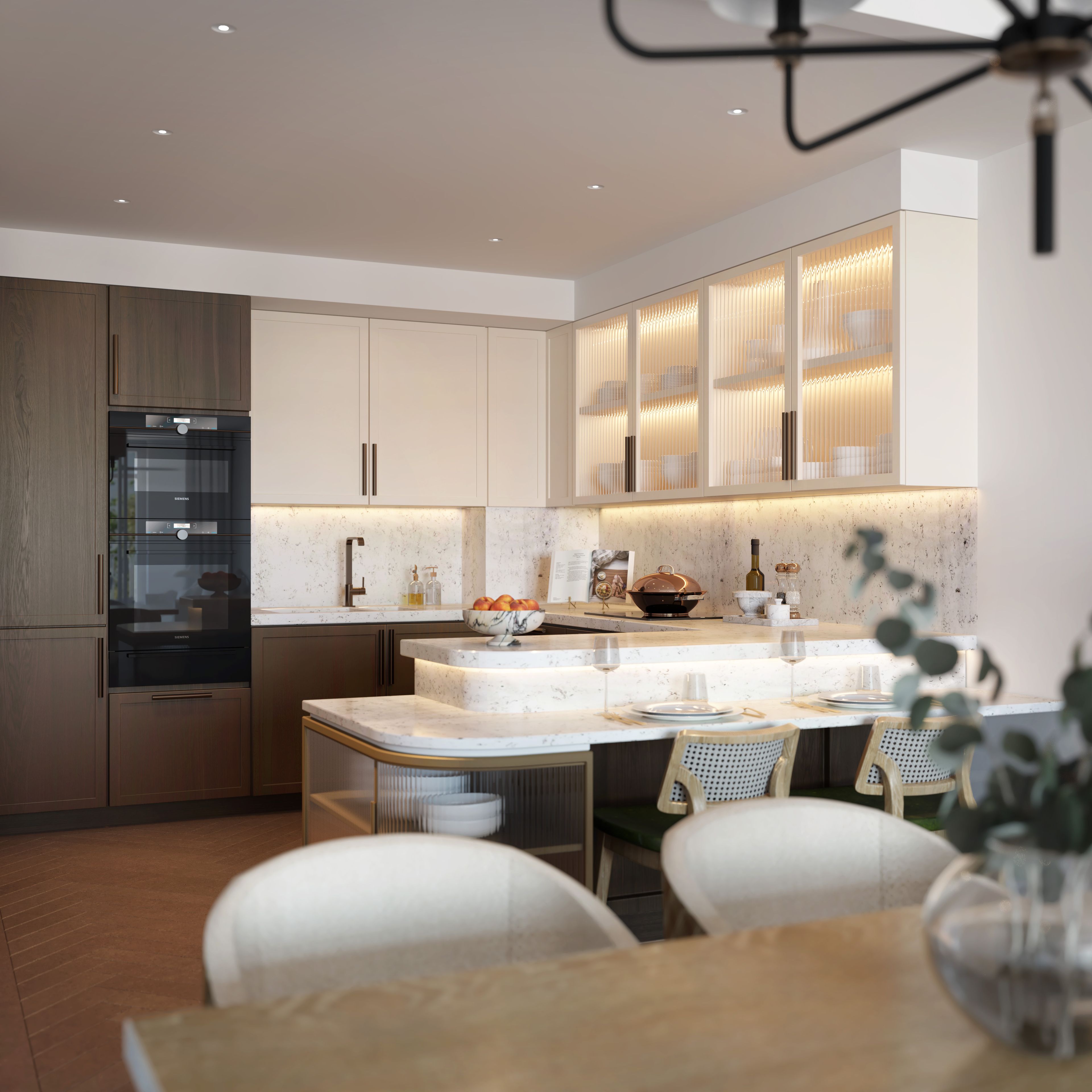 Curated for effortless cooking, dining, relaxing and hosting, your open-plan kitchen and living room shapes the heart of your home. Engineered wood flooring and high ceilings add refinement. The well-equipped kitchen features fully integrated appliances, including an electric hob, multifunction oven, fridge/freezer and a Fisher & Paykel double-drawer dishwasher.